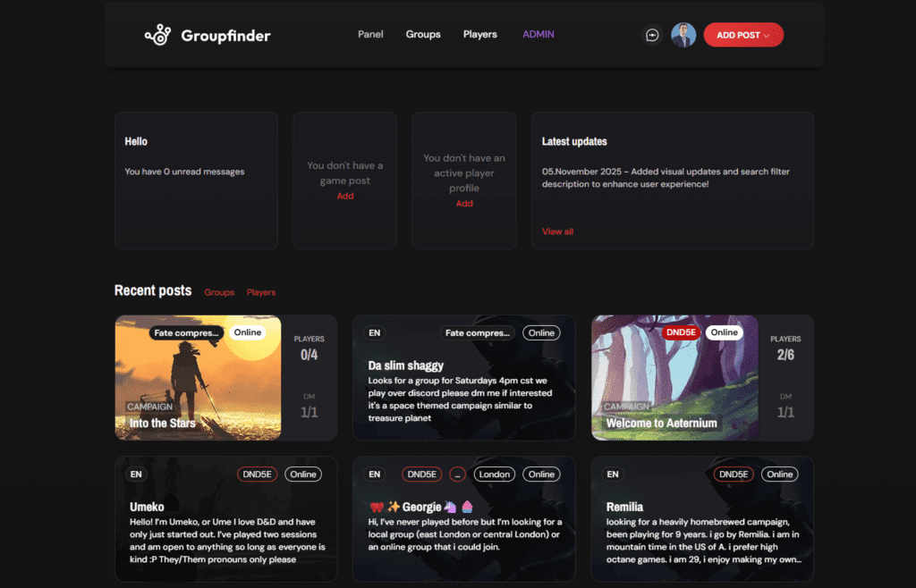 Whether you’re looking for a casual one-shot, a long-term campaign, or even players for other RPGs like Pathfinder or Cyberpunk, Groupfinder makes the process simple and organized.